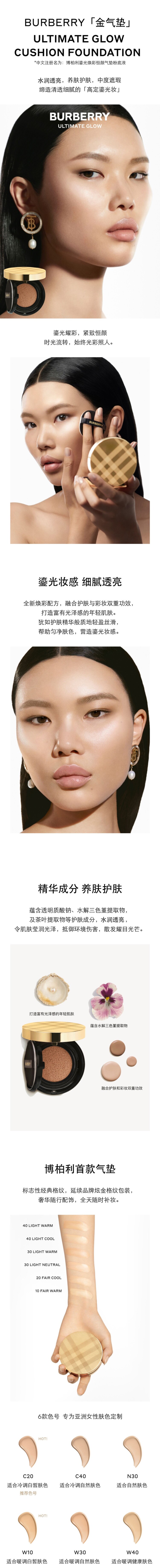 全新鎏光焕彩恒颜气垫粉底液,博柏利至臻奢华的精华粉底液。作为护肤品与彩妆的完美结合,昼夜打造绽放青春光彩的立体妆容。配方蕴含焕颜成分,糅合包括透明质酸和紫罗兰提取物在内的多种活性护肤成分。全天补水保湿,令肌肤丰盈光滑,面容更显年轻,光泽动人。