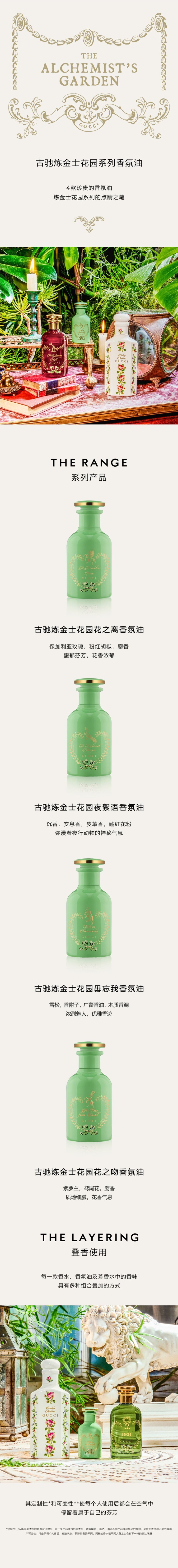 Gucci奢华系列香氛开启充满想象力与魔幻故事的新篇章:The Alchemist's Garden 受到炼金术的启发,亚力山卓•米开理以香氛制作艺术重新构想黄金的转变过程,创造出七款香氛、四款精油、三款香氛喷雾和一款香烛。 每一款香氛、香氛喷雾以及精油中的独特香味具有多种组合叠加的方式,其定制性和可变性使每个人使用后都会在空气中弥留着属于自己的独特芬芳。 “精油和香氛喷雾可为你打造个性宣言,在你钟情的香氛中加上精油或香氛喷雾就能够定制出属于自己独一无二的香迹。每一款精油或香氛喷雾都能够和任意一款香水进行混合叠加,令你有足够的自由去探索并发现自己最爱的香味,正如术士发现炼金的配方一样。”,Alberto Morillas说到。 月光小夜曲是一款薰衣草香水。复古香调的确令人振奋,会令此款香水散发馥郁香气,瞬间让人精神焕发。