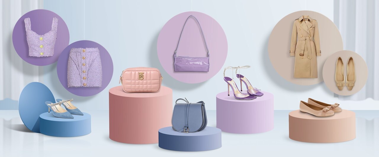 When wearing pastel colors, it’s important to pay attention to texture as well. Introducing different textures will definitely make your outfit appear more thought-out and stylish. When all the items are in the same shade, everything goes. Purple lovers should check out the seductive Saeda Sandal 100 in pastel purple from Jimmy Choo. These vampish PVC see-throughs give the innocent color a touch of light-hearted mischievousness. Another great addition to your pastel wardrobe is the Karo Embossed Patent Leather Shoulder Bag from BY FAR. The design is not the usual baguette silhouette, but an elvish diamond shape made of patent high-gloss finish leather, and with the brand’s diagonal BF logo motif embossed all over the bag. The play of textures and materials in the same cool lavender hue is one way to show off your masterful styling skills.