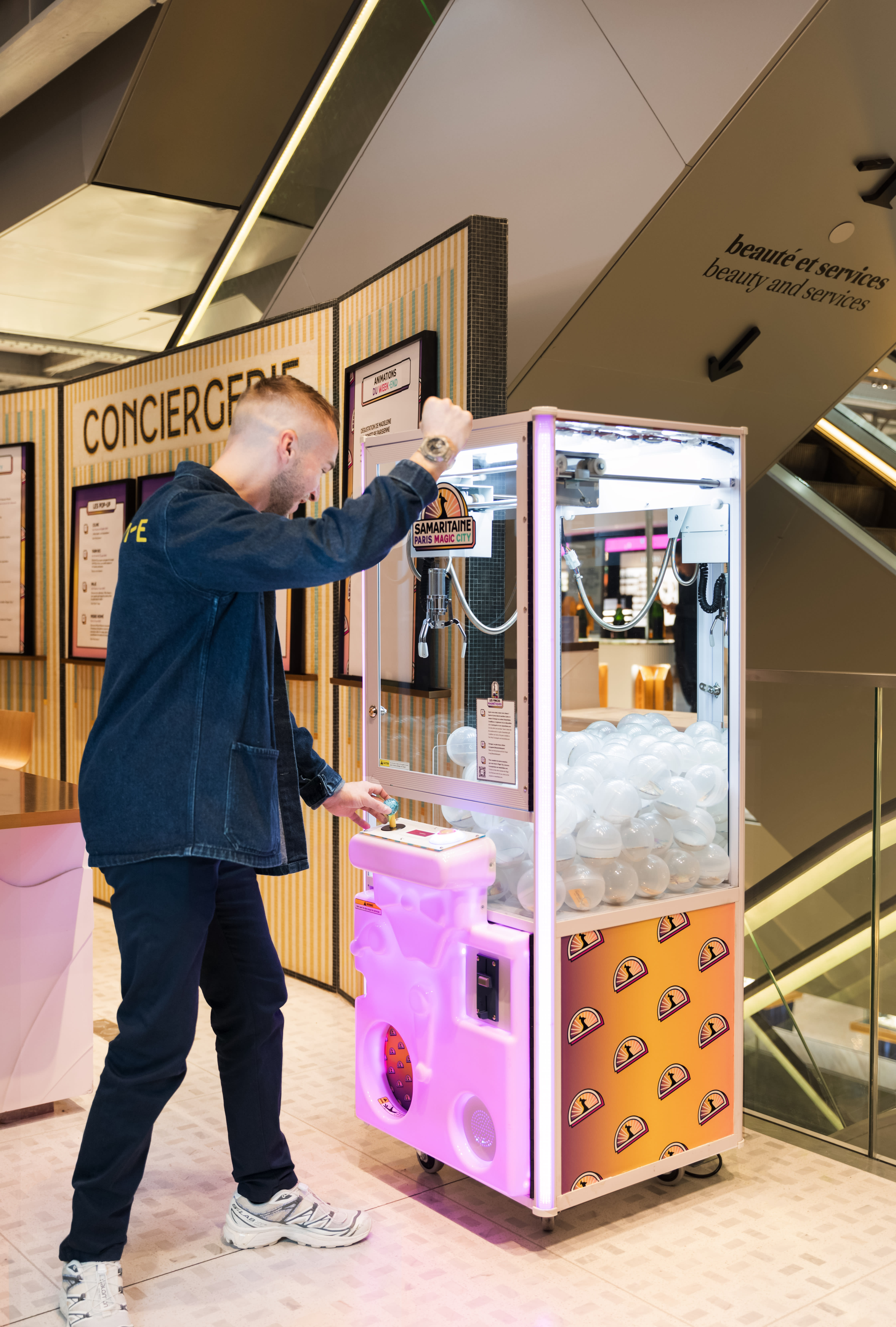 De l’autre côté du magasin, au rez-de-chaussée Pont-Neuf, vous aurez l’occasion de tenter votre chance aux pinces magnétiques ! Après votre achat, allez insérer le jeton dans la machine à pinces, et essayez d’attraper un cadeau Samaritaine. Conditions et règlement de jeu disponibles à la Conciergerie.